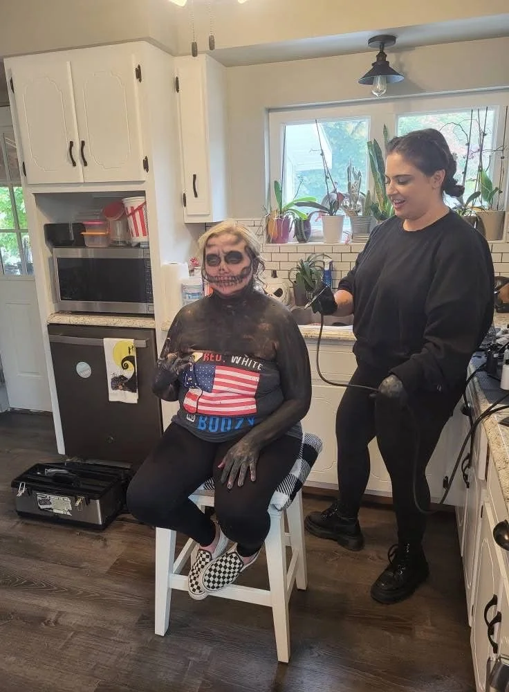 A woman with her face painted like a skeleton and wearing a tank top with an American flag sits on a stool. Another woman is standing beside her, holding a tool near her arm, in a kitchen with white cabinets and a window with potted plants.